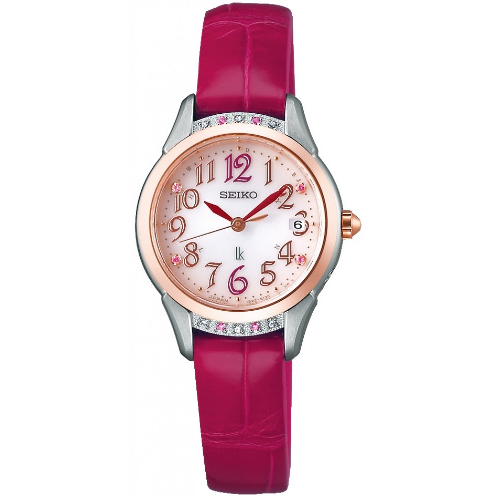 Seiko Lukia Pierre Hermé Produce Limited Edition SSVW140 - ladies watch produced by Seiko. It has Japanese solar quartz movement and 1B22 calibre. Stainless steel, gold plated case of round shape. Case dimensions are 25.5 mm. in diameter and 8 mm. in thickness. The dial of this Seiko watch is pink. Display type: analog. This timepiece has sapphire, super clear coating glass. Crocodile leather band, band color: pink. 100 m. water resistance. The watch is from Seiko Lukia collection. The following features are equipped: antimagnetic, limited edition, date, diamond set, perpetual calendar, radio controlled.