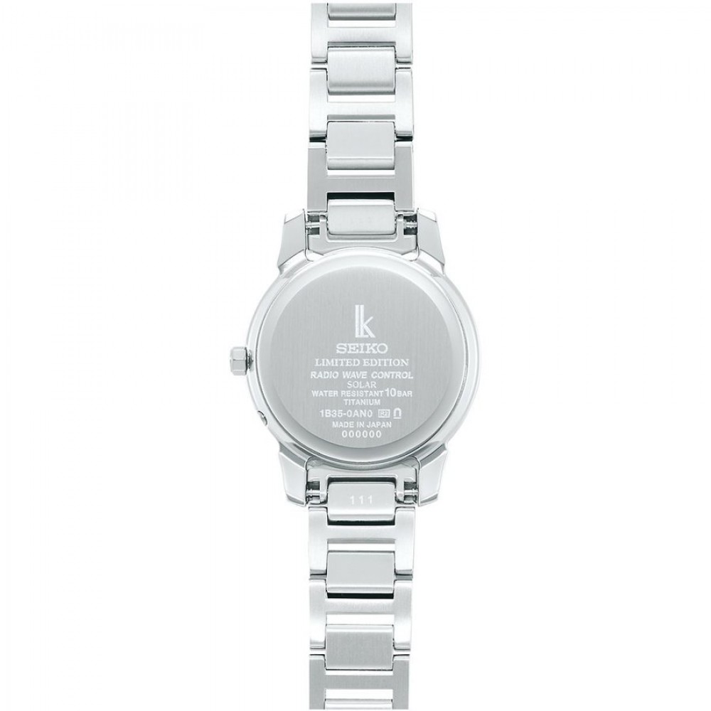 Seiko Lukia Seiko 140th Anniversary Limited Model SSQV098 - ladies watch produced by Seiko. It has Japanese solar quartz movement and 1B35 calibre. Titanium, hard coating, gold plated case of round shape. Case dimensions are 28 mm. in diameter and 7.6 mm. in thickness. The dial of this Seiko watch is mother of pearl. Display type: analog. This timepiece has sapphire, super clear coating glass. Titanium, hard coating band, band color: silver. 100 m. water resistance. The watch is from Seiko Lukia collection. The following features are equipped: glowing hands, radio controlled, antimagnetic, date, perpetual calendar, world time, limited edition.