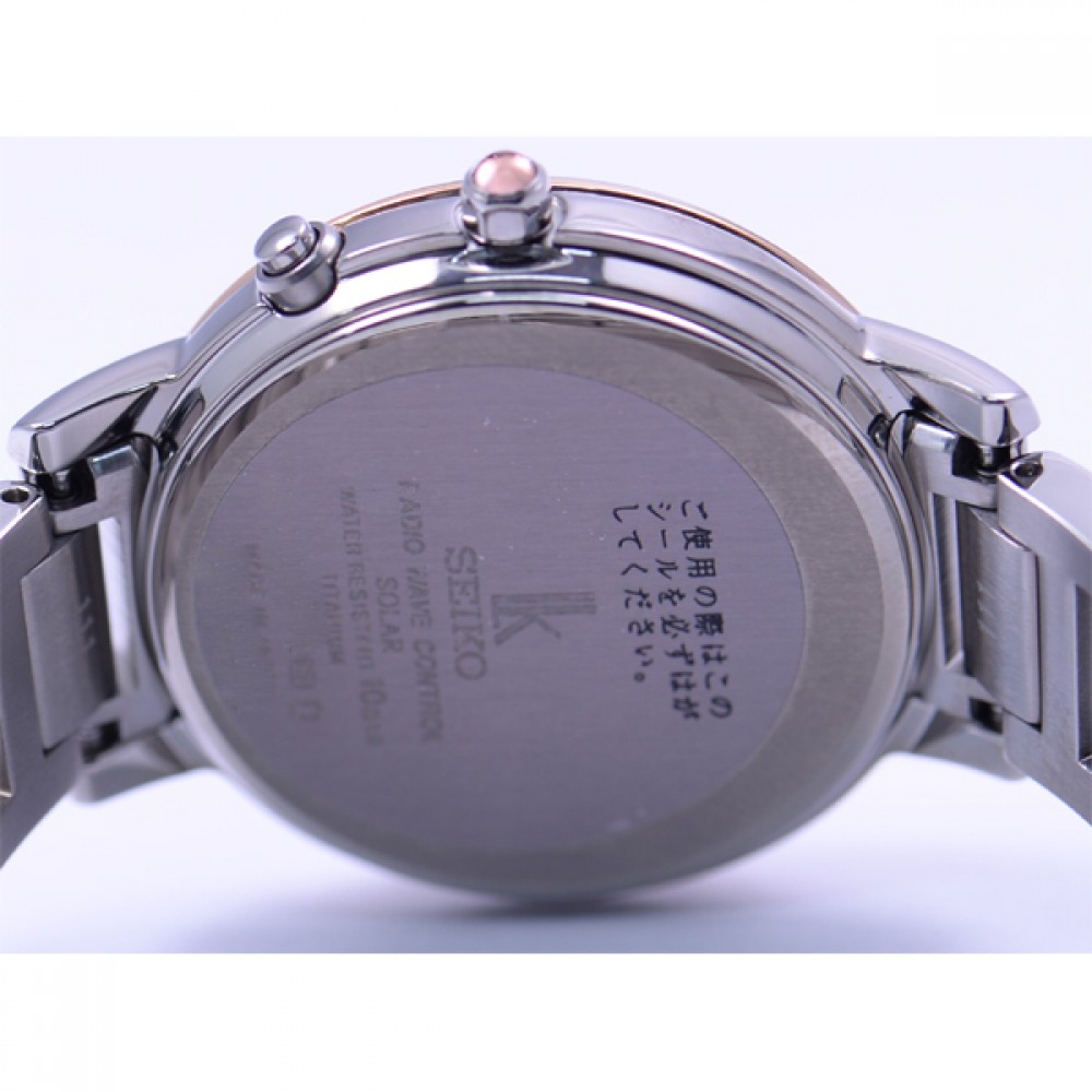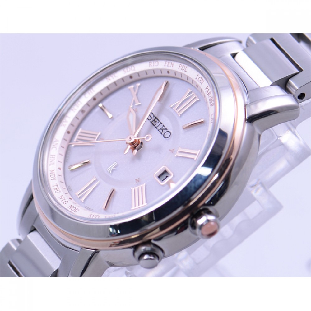 Seiko Lukia SSQV028 - ladies watch made by Seiko. It is equipped with Japanese solar quartz movement and 1B25 calibre. Titanium, hard coating, gold plated case of round shape. Case dimensions are 30.6 mm. in diameter and 8.6 mm. in thickness. The dial of this Seiko watch is pink. Display type: analog. This timepiece has sapphire, super clear coating glass. Titanium, hard coating band, band color: silver. 100 m. water resistance. The watch is from Seiko Lukia collection. The following features are equipped: date, radio controlled, perpetual calendar, world time, antimagnetic, glowing hands.