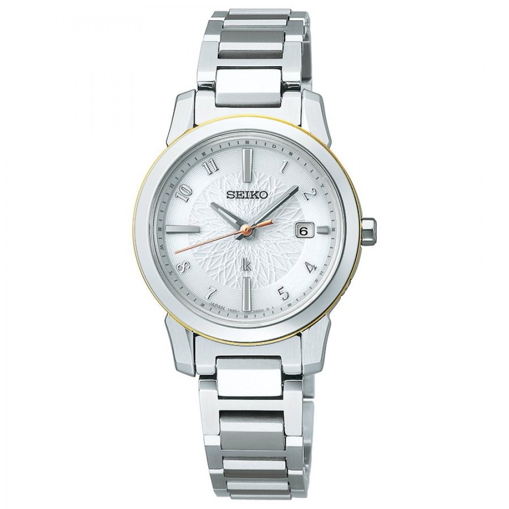 Seiko Lukia SSQV092 - ladies watch made by Seiko. It has Japanese solar quartz movement and 1B35 calibre. Titanium, hard coating, gold plated case of round shape. Case dimensions are 28 mm. in diameter and 7.6 mm. in thickness. The dial of this Seiko watch is gray. Display type: analog. This timepiece has sapphire, super clear coating glass. Titanium, hard coating band, band color: silver. 100 m. water resistance. The watch is from Seiko Lukia collection. The following features are equipped: glowing hands, radio controlled, antimagnetic, date, perpetual calendar, world time.