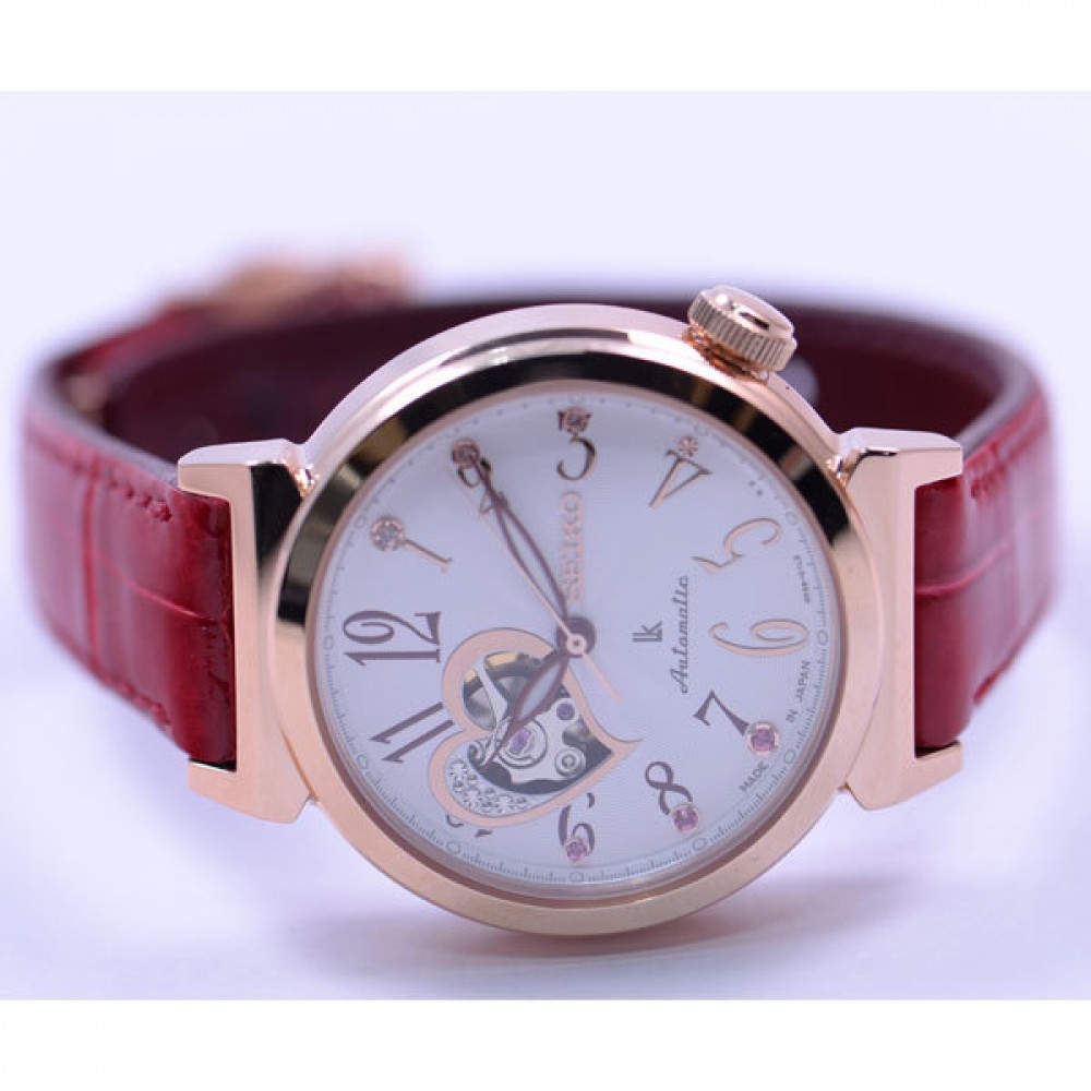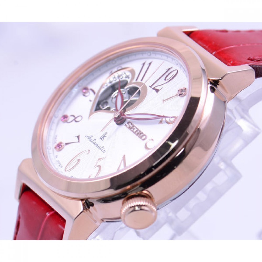 Seiko Lukia SSVM030 - ladies watch manufactured by Seiko. It has Japanese automatic movement and 4R38 calibre. Stainless steel, gold plated case of round shape. Case dimensions are 34.6 mm. in diameter and 11 mm. in thickness. The dial of this Seiko watch is white, silver. Display type: analog. This timepiece has sapphire glass. Crocodile leather band, band color: red. 100 m. water resistance. The watch is from Seiko Lukia collection. The following features are equipped: glowing hands, glowing markers, limited edition, crystal set, antimagnetic.