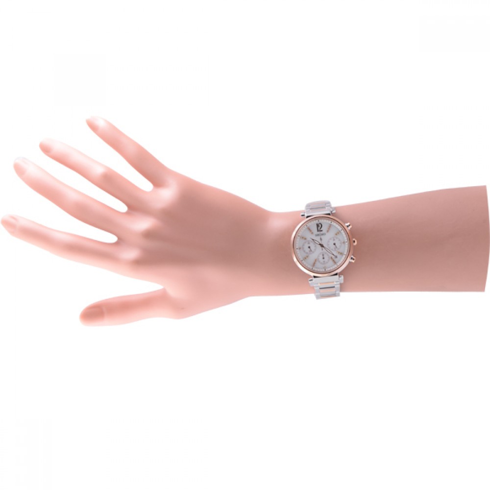 Seiko Lukia SSVS030 - ladies watch manufactured by Seiko. It is equipped with Japanese solar quartz movement and V175 calibre. Stainless steel, gold plated case of round shape. Case dimensions are 36.2 mm. in diameter and 10.9 mm. in thickness. The dial of this Seiko watch is white. Display type: analog. This timepiece has sapphire, super clear coating glass. Stainless steel, gold plated band, band color: silver, gold. 100 m. water resistance. The watch is from Seiko Lukia collection. The following features are equipped: antimagnetic, date, chronograph, crystal set, limited edition, glowing hands.