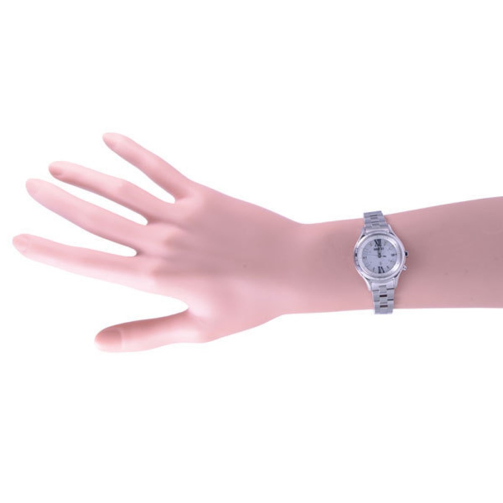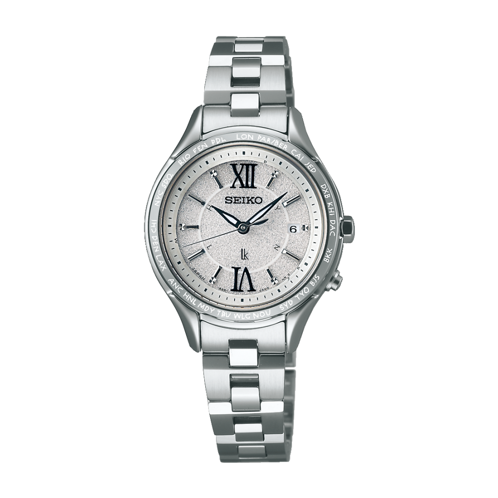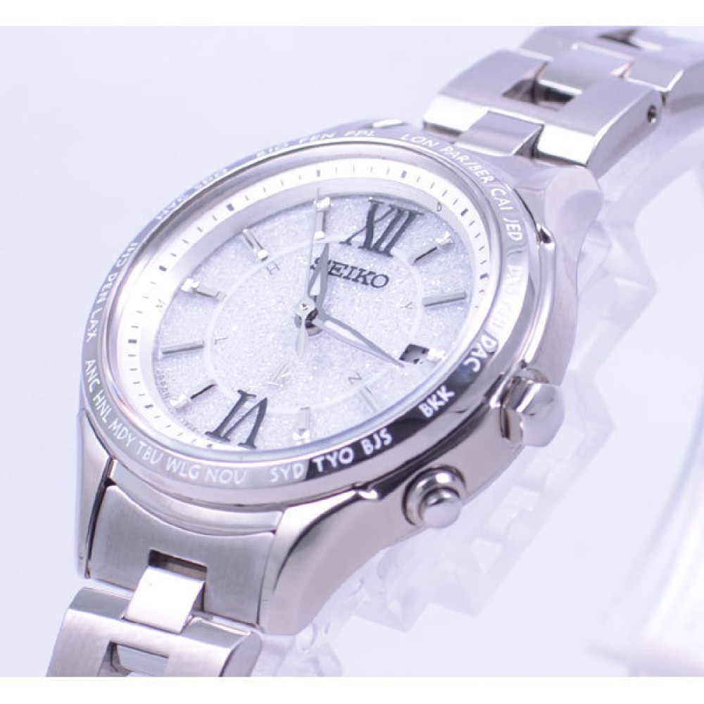 Seiko Lukia SSVV011 - ladies watch made by Seiko. It has Japanese solar quartz movement and 1B25 calibre. Stainless steel, hard coating case of round shape. Case dimensions are 28.3 mm. in diameter and 8.7 mm. in thickness. The dial of this Seiko watch is silver. Display type: analog. This timepiece has sapphire, super clear coating glass. Stainless steel band, band color: silver. 100 m. water resistance. The watch is from Seiko Lukia collection. The following features are equipped: antimagnetic, date, perpetual calendar, world time, glowing hands, radio controlled.