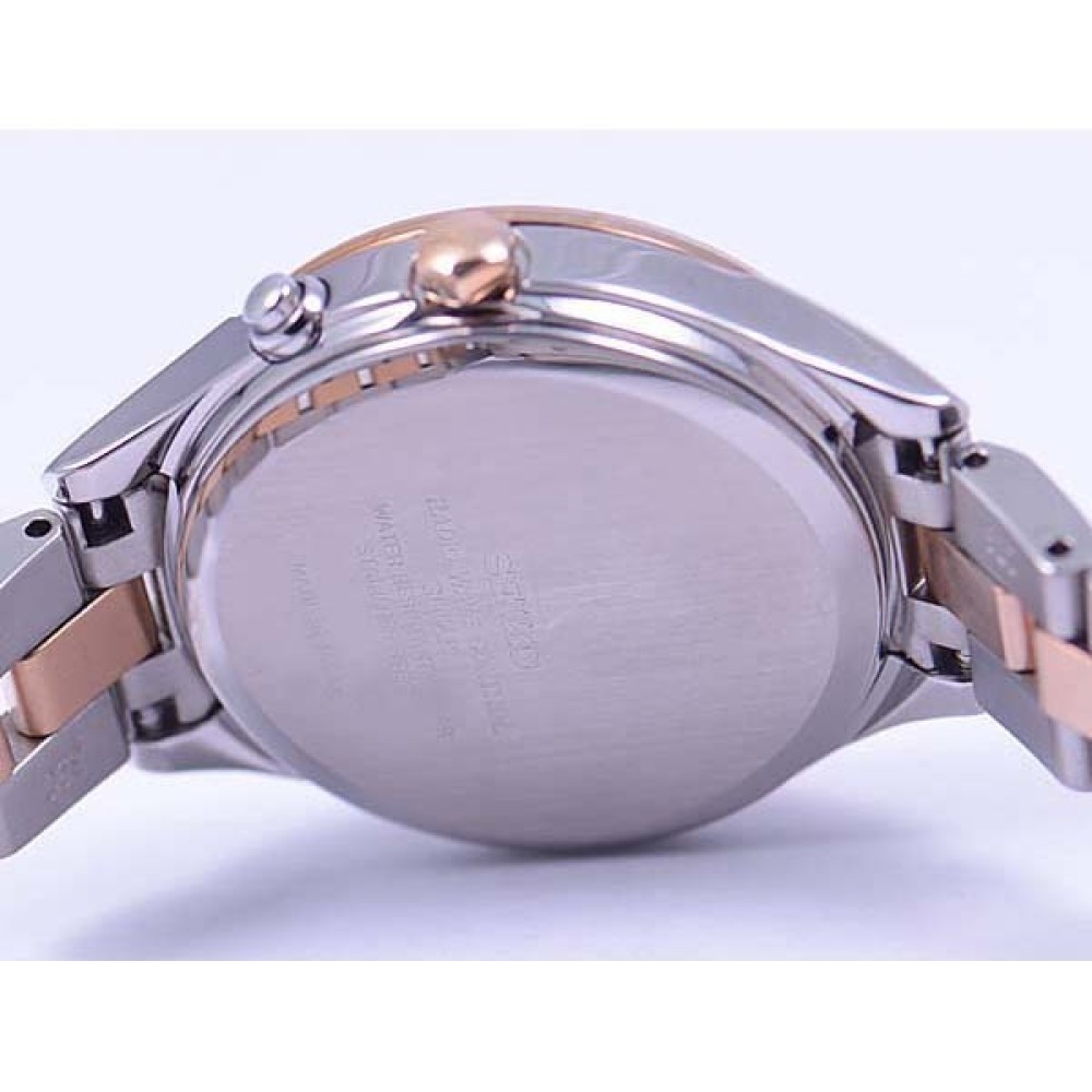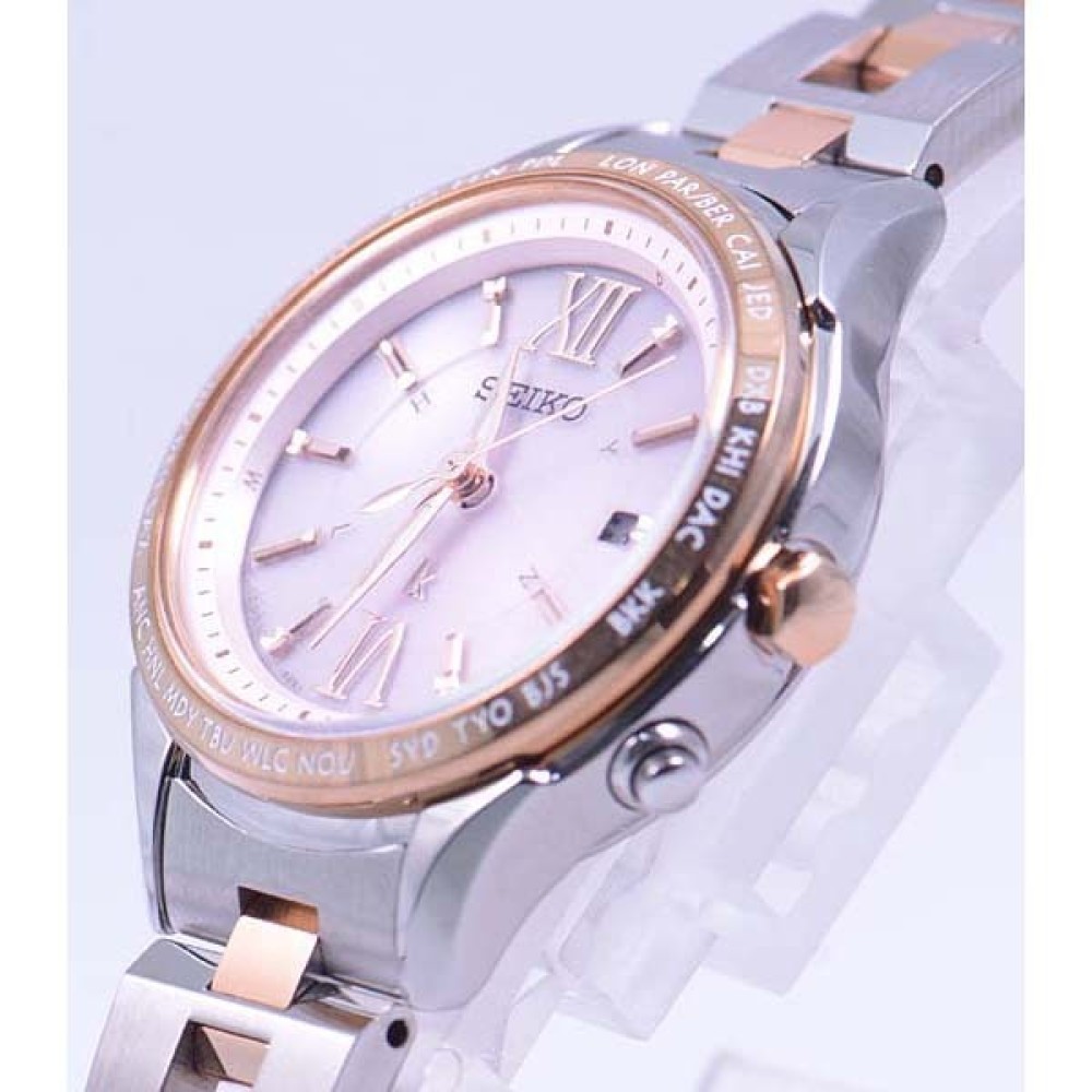 Seiko Lukia SSVV012 - ladies watch made by Seiko. It has Japanese solar quartz movement and 1B25 calibre. Stainless steel, hard coating, gold plated case of round shape. Case dimensions are 28.3 mm. in diameter and 8.7 mm. in thickness. The dial of this Seiko watch is pink. Display type: analog. This timepiece has sapphire, super clear coating glass. Stainless steel, hard coating, gold plated band, band color: silver, gold. 100 m. water resistance. The watch is from Seiko Lukia collection. The following features are equipped: antimagnetic, date, world time, perpetual calendar, glowing hands, radio controlled.