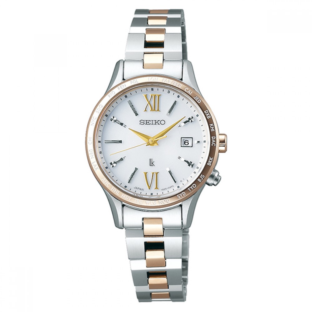 Seiko Lukia SSVV042 - ladies watch manufactured by Seiko. It has Japanese solar quartz movement and 1B35 calibre. Stainless steel, gold plated, hard coating case of round shape. Case dimensions are 27.5 mm. in diameter and 7.6 mm. in thickness. The dial of this Seiko watch is gray. Display type: analog. This timepiece has sapphire, super clear coating glass. Stainless steel, gold plated, hard coating band, band color: silver, gold. 100 m. water resistance. The watch is from Seiko Lukia collection. The following features are equipped: radio controlled, antimagnetic, date, perpetual calendar, world time.