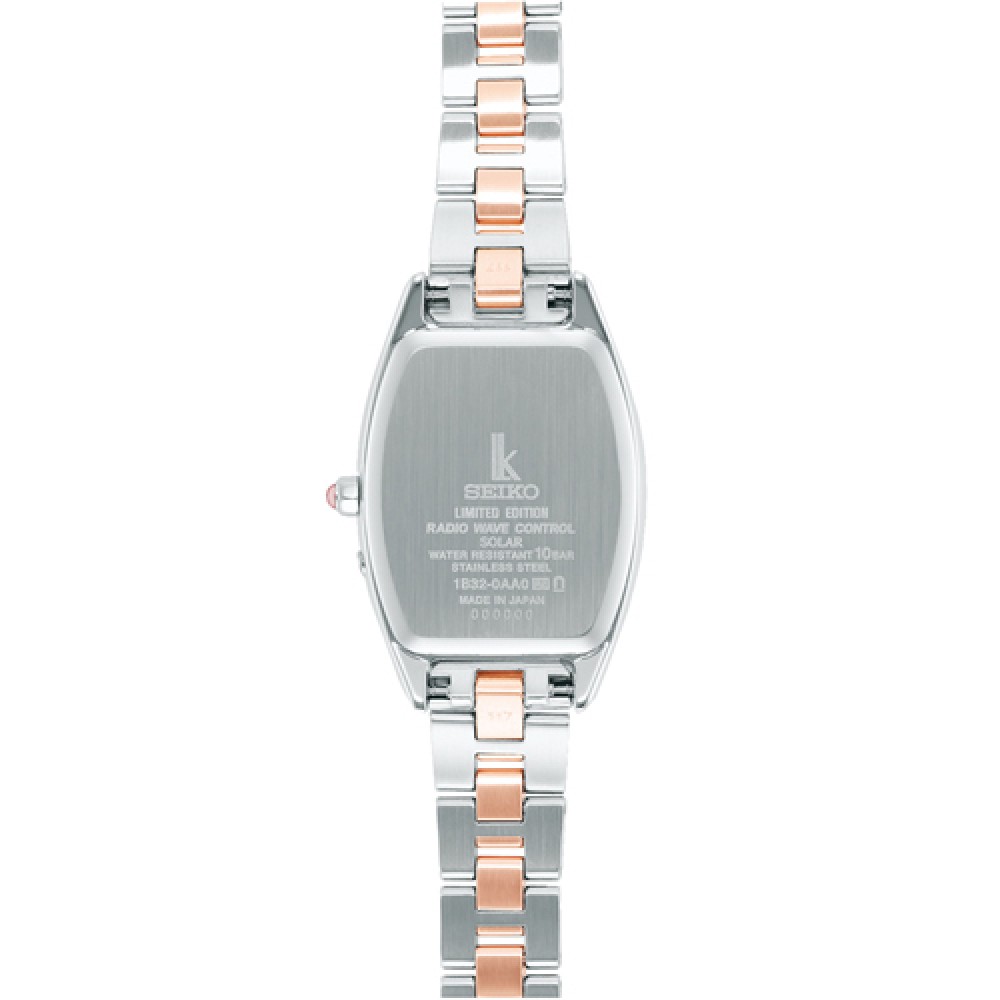 Seiko Lukia SSVW124 - ladies watch manufactured by Seiko. It is equipped with Japanese solar quartz movement and 1B32 calibre. Stainless steel, hard coating, gold plated case of tonneau shape. Case dimensions are 23.9 mm. in diameter and 7.7 mm. in thickness. The dial of this Seiko watch is pink, blue. Display type: analog. This timepiece has sapphire, super clear coating glass. Stainless steel, hard coating, gold plated band, band color: silver, gold. 100 m. water resistance. The watch is from Seiko Lukia collection. The following features are equipped: antimagnetic, date, limited edition, crystal set, radio controlled, perpetual calendar.