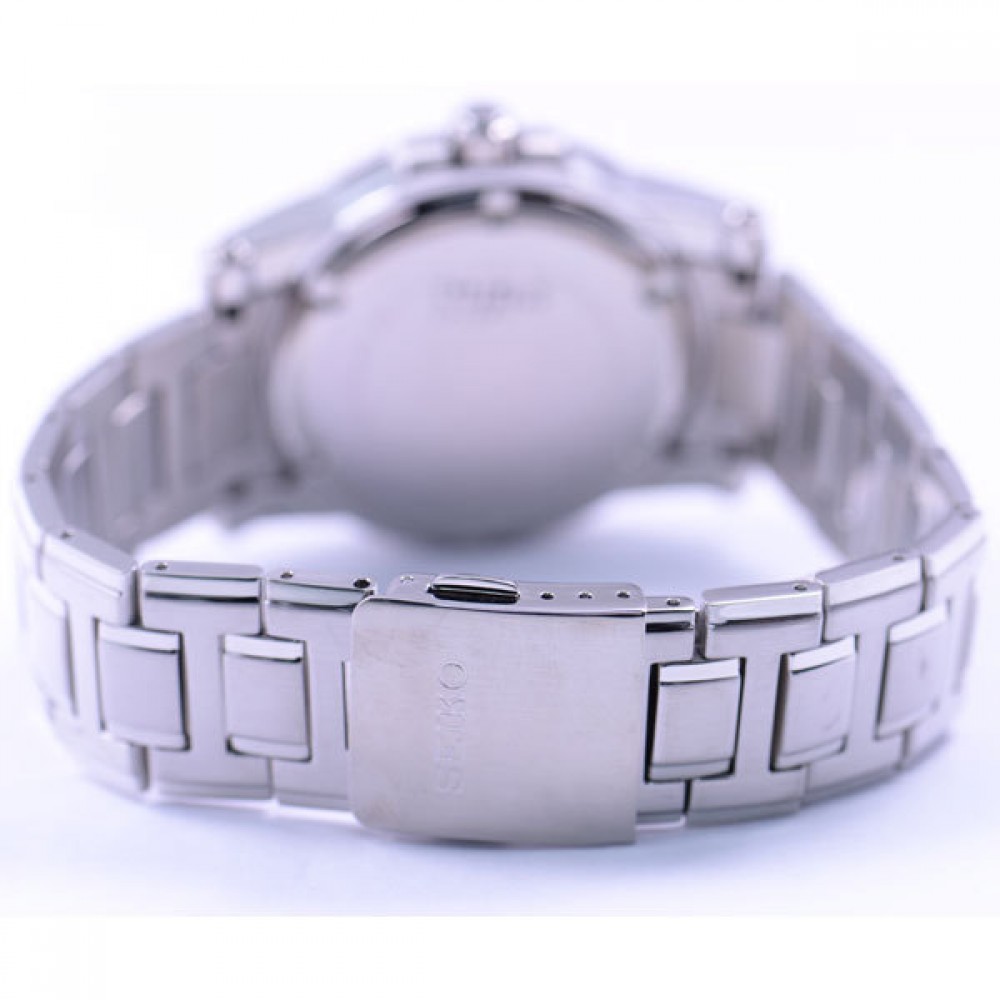 Seiko Premier SCJL003 - men's watch made by Seiko. It is equipped with Japanese quartz movement and 6N76 calibre. Stainless steel case of round shape. Case dimensions are 41.3 mm. in diameter and 10.2 mm. in thickness. The dial of this Seiko watch is black. Display type: analog. This timepiece has sapphire glass. Stainless steel band, band color: silver. 100 m. water resistance. The watch is from Seiko Premier collection. The following features are equipped: date, antimagnetic.