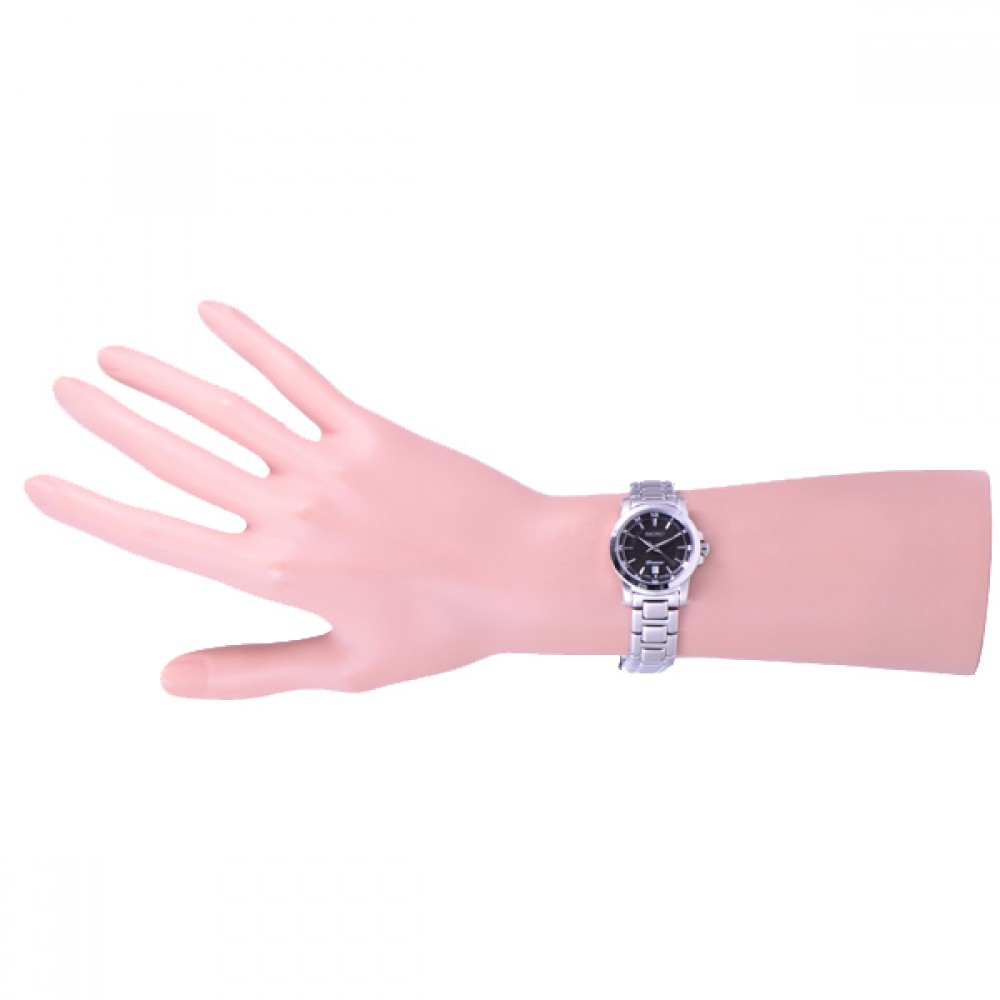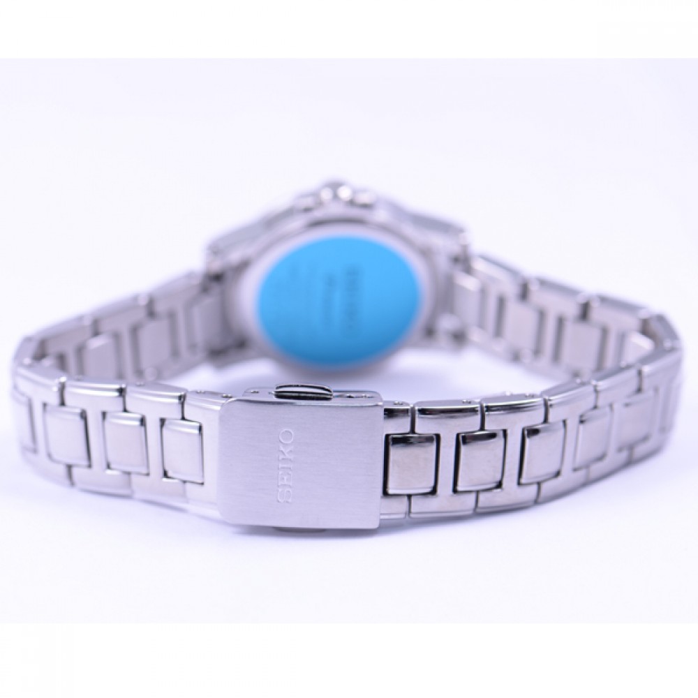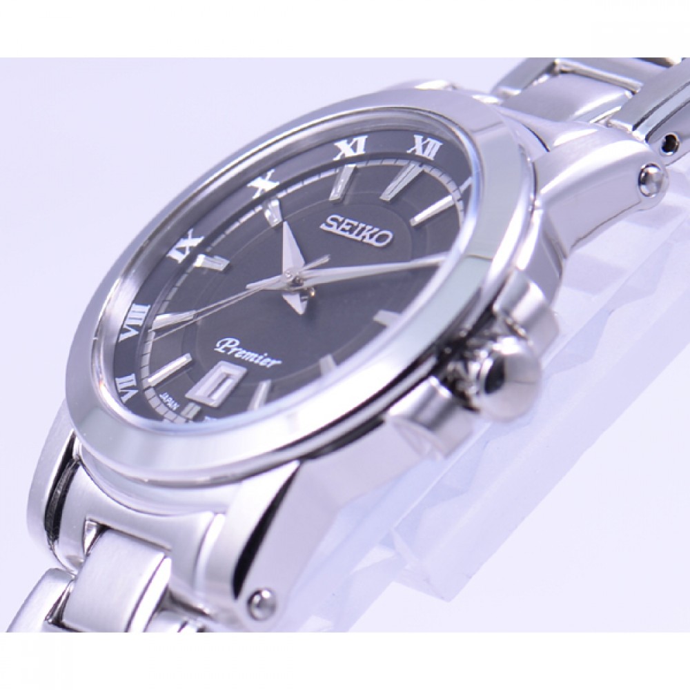Seiko Premier SRJB015 - ladies watch made by Seiko. It has Japanese quartz movement and 7N82 calibre. Stainless steel case of round shape. Case dimensions are 27.5 mm. in diameter and 6.8 mm. in thickness. The dial of this Seiko watch is black. Display type: analog. This timepiece has sapphire glass. Stainless steel band, band color: silver. 100 m. water resistance. The watch is from Seiko Premier collection. The following features are equipped: antimagnetic, date.