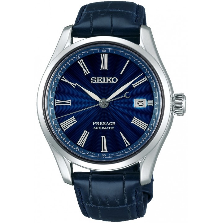 Seiko Presage Cloisonne Limited Edition SARX059 - men's watch produced by Seiko. It has Japanese automatic movement and 6R15 calibre. Stainless steel case of round shape. Case dimensions are 40 mm. in diameter and 12.4 mm. in thickness. The dial of this Seiko watch is blue. Display type: analog. This timepiece has sapphire, antireflection coating glass. Crocodile band, band color: blue. 100 m. water resistance. The watch is from Seiko Presage collection. The following features are equipped: antimagnetic, date, limited edition.