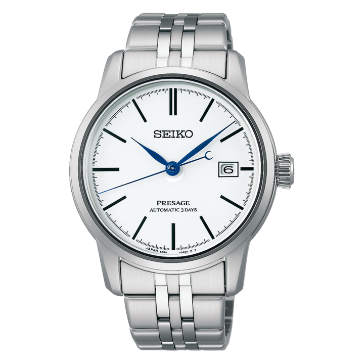 Seiko Presage Craftsmanship Series SARX105 - men's watch made by Seiko. It has Japanese automatic movement and 6R55 calibre. Diamond shield, stainless steel case of round shape. Case dimensions are 40.2 mm. in diameter and 12.1 mm. in thickness. The dial of this Seiko watch is white enamel. Display type: analog. This timepiece has sapphire, antireflection coating glass. Stainless steel band, band color: silver. 100 m. water resistance. The watch is from Seiko Presage collection. The following features are equipped: antimagnetic, date.