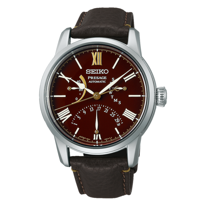Seiko Presage Prestige Line Seiko Watch 110th Anniversary Limited Edition SARD019 - men's watch manufactured by Seiko. It is equipped with Japanese automatic movement and 6R24 calibre. Stainless steel, diamond shield case of round shape. Case dimensions are 40.2 mm. in diameter and 12.8 mm. in thickness. The dial of this Seiko watch is reddish brown, lacquer. Display type: analog. This timepiece has sapphire, antireflection coating glass. Calf leather band, band color: brown. 100 m. water resistance. The watch is from Seiko Presage collection. The following features are equipped: date, day, power reserve indicator, antimagnetic, limited edition.