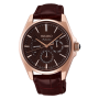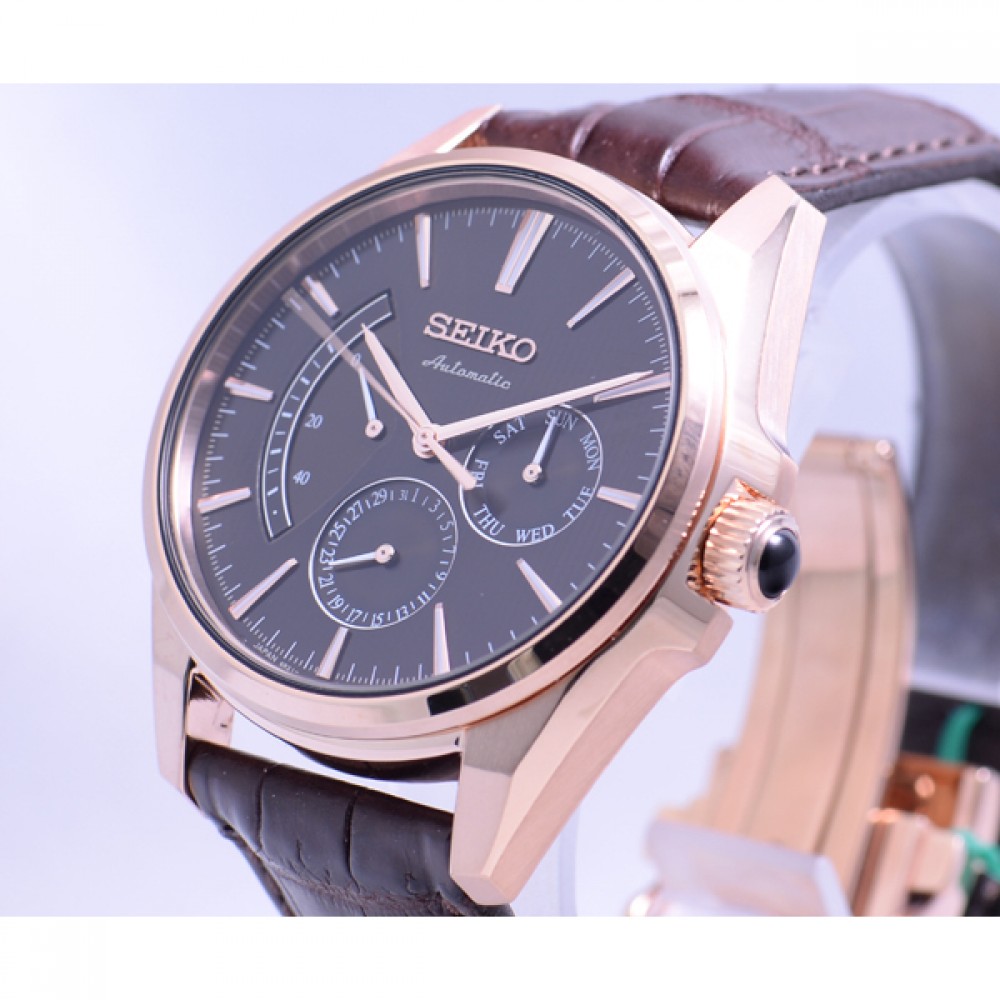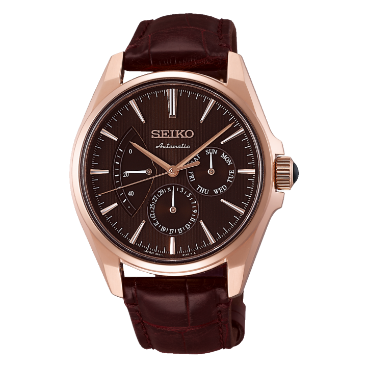 Seiko Presage SARW034 - men's watch produced by Seiko. It has Japanese automatic movement and 6R21 calibre. Stainless steel, gold plated case of round shape. Case dimensions are 39.5 mm. in diameter and 12.4 mm. in thickness. The dial of this Seiko watch is brown. Display type: analog. This timepiece has sapphire, antireflection coating glass. Crocodile leather band, band color: brown. 100 m. water resistance. The watch is from Seiko Presage collection. The following features are equipped: date, day, antimagnetic, power reserve indicator.