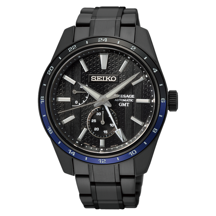 Seiko Presage Sharp Edged Series ZERO HALLIBURTON Limited Edition SPB271JC - men's watch manufactured by Seiko. It is equipped with Japanese automatic movement and 6R64 calibre. Stainless steel, hard coating case of round shape. Case dimensions are 42.2 mm. in diameter and 13.7 mm. in thickness. The dial of this Seiko watch is black. Display type: analog. This timepiece has sapphire, antireflection coating glass. Stainless steel, hard coating band, band color: black. 100 m. water resistance. The watch is from Seiko Presage collection. The following features are equipped: antimagnetic, date, glowing hands, glowing markers, dual time, power reserve indicator, limited edition.