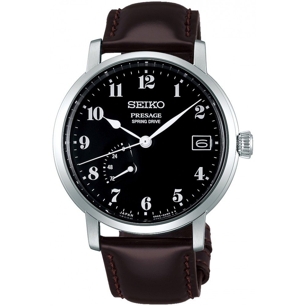 Seiko Presage Spring Drive SARR003 - men's watch made by Seiko. It has Japanese automatic movement and 5R65 calibre. Stainless steel, hard coating case of round shape. Case dimensions are 40 mm. in diameter and 13.1 mm. in thickness. The dial of this Seiko watch is black. Display type: analog. This timepiece has sapphire, super clear coating glass. Leather band, band color: brown. 100 m. water resistance. The watch is from Seiko Presage collection. The following features are equipped: antimagnetic, date, power reserve indicator.