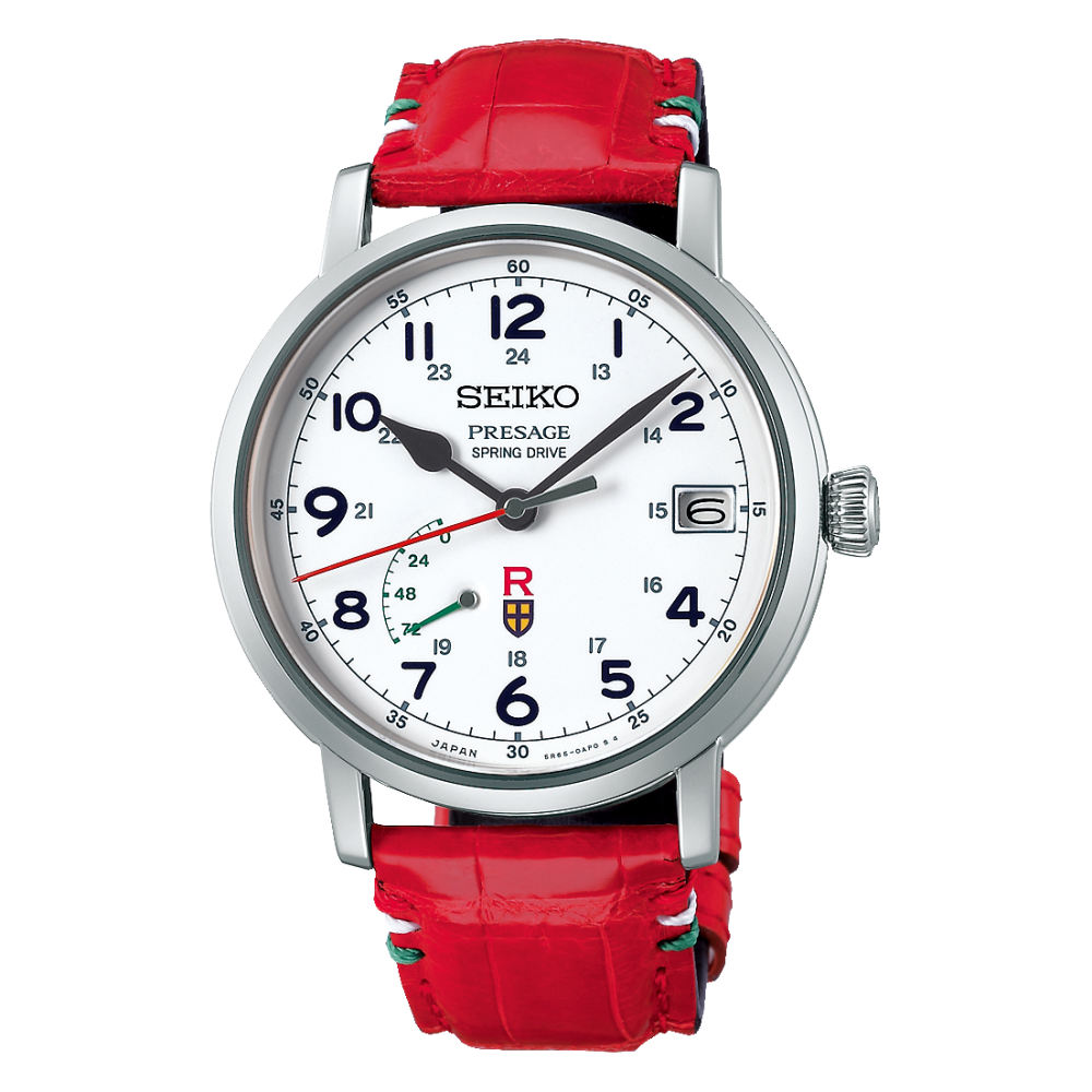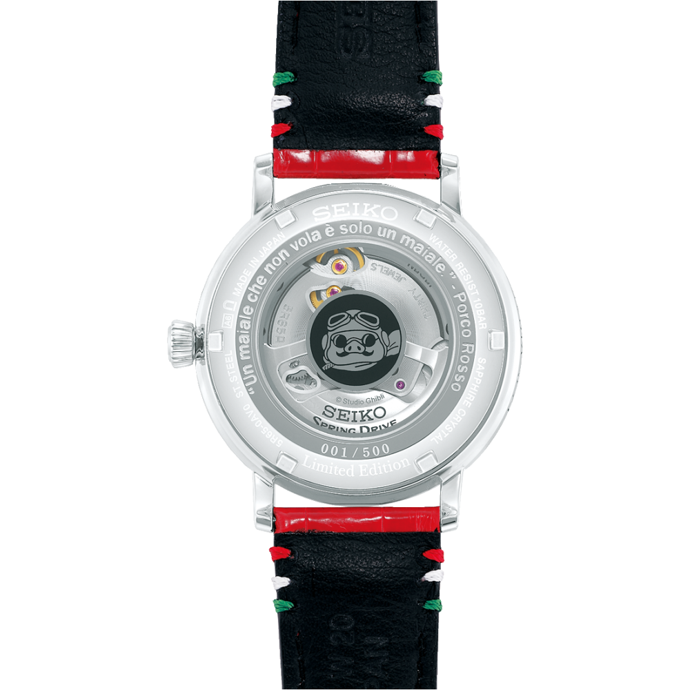 Seiko Presage Studio Ghibli Porco Rosso Collaboration Limited Model SARR005 - men's watch made by Seiko. It is equipped with Japanese spring drive movement and 5R65 calibre. Stainless steel, hard coating case of round shape. Case dimensions are 40 mm. in diameter and 13.1 mm. in thickness. The dial of this Seiko watch is white. Display type: analog. This timepiece has sapphire, super clear coating glass. Crocodile band, band color: red, black. 100 m. water resistance. The watch is from Seiko Presage collection. The following features are equipped: antimagnetic, date, limited edition, power reserve indicator.