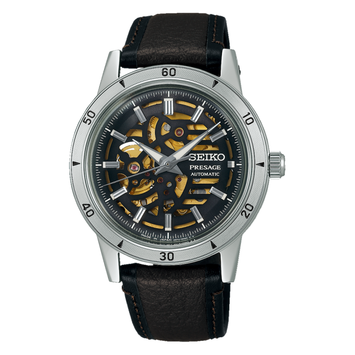 Seiko Presage Style 60's SARY257 - men's watch produced by Seiko. It is equipped with Japanese automatic movement and 4R72 calibre. Stainless steel case of round shape. Case dimensions are 39.5 mm. in diameter and 12 mm. in thickness. The dial of this Seiko watch is black, gold. Display type: analog. This timepiece has hardlex glass. Cowhide leather band, band color: black, brown. 50 m. water resistance. The watch is from Seiko Presage collection. The following features are equipped: glowing hands, glowing markers, antimagnetic.