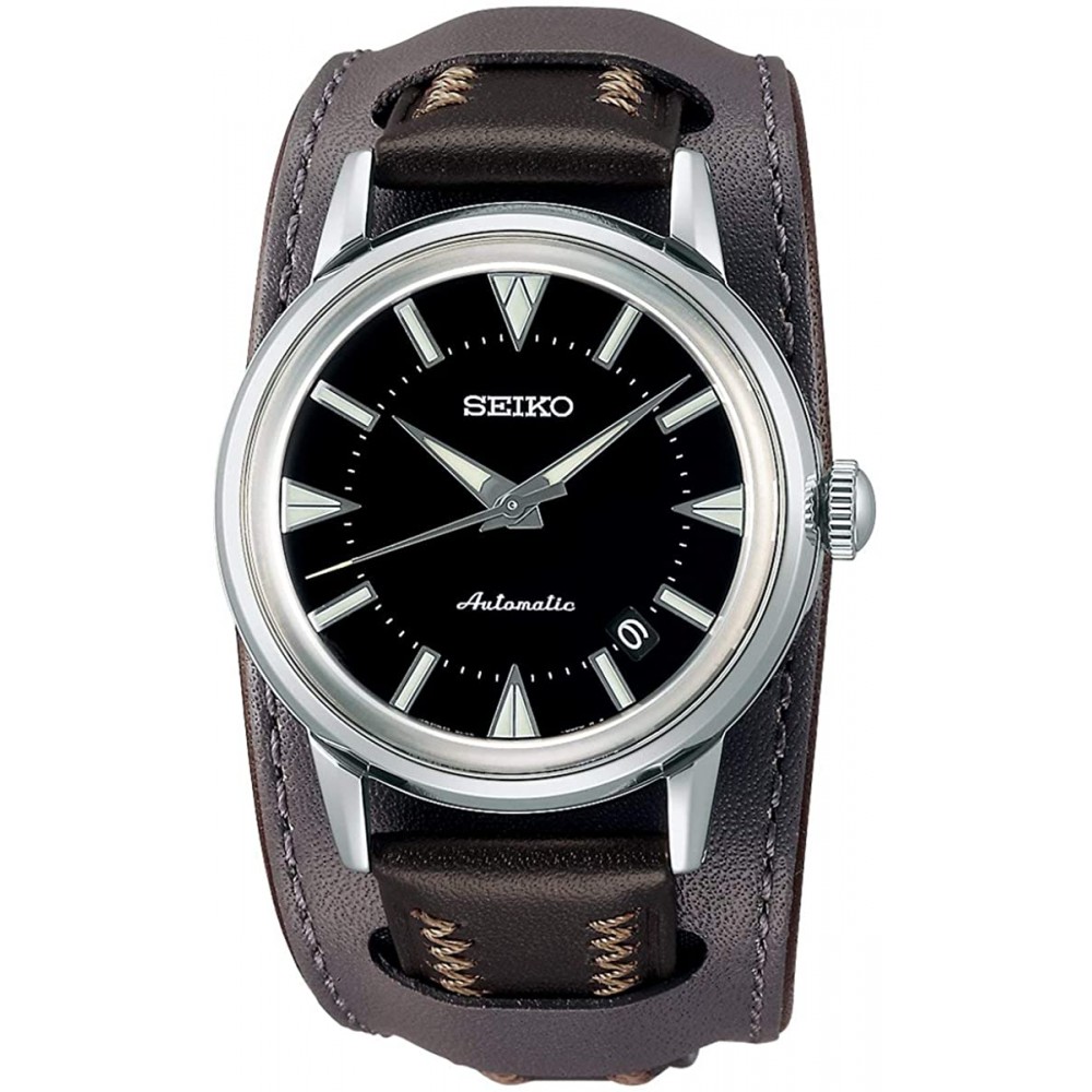 Seiko Prospex 1959 First Alpinist Reprint Design Limited Model SBEN001 - men's watch made by Seiko. It has Japanese automatic movement and 6L35 calibre. Stainless steel case of round shape. Case dimensions are 36.6 mm. in diameter and 11.1 mm. in thickness. The dial of this Seiko watch is black. Display type: analog. This timepiece has sapphire, antireflection coating glass. Leather band, band color: brown. 100 m. water resistance. The watch is from Seiko Prospex collection. The following features are equipped: glowing hands, glowing markers, antimagnetic, date, limited edition.