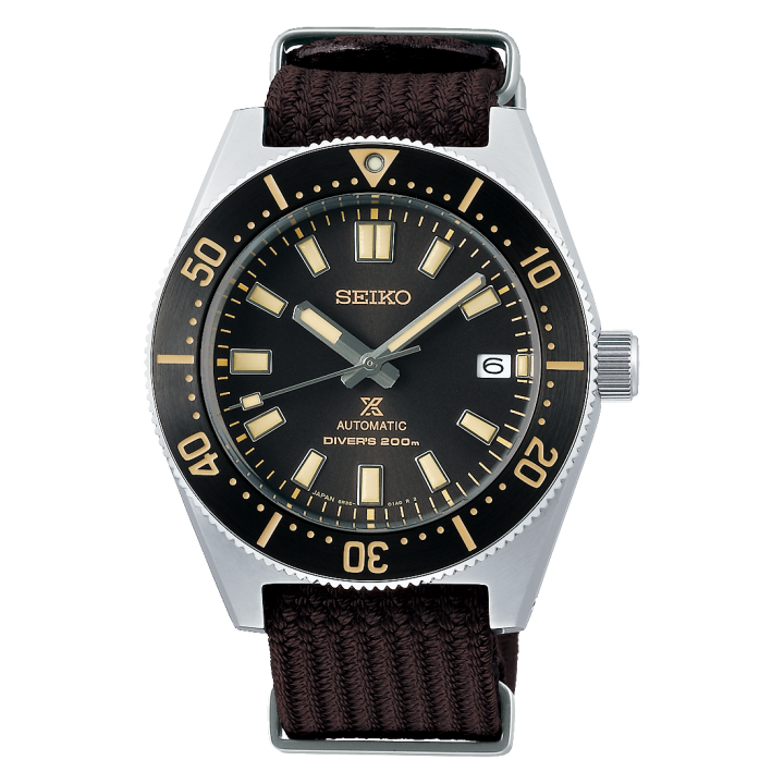 Seiko Prospex 1965 Mechanical Divers Contemporary Design SBDC141 - men's watch produced by Seiko. It is equipped with Japanese automatic movement and 6R35 calibre. Stainless steel, hard coating case of round shape. Case dimensions are 40.5 mm. in diameter and 13.2 mm. in thickness. The dial of this Seiko watch is black. Display type: analog. This timepiece has sapphire, antireflection coating glass. Fabric band, band color: brown, beige. 200 m. water resistance. The watch is from Seiko Prospex collection. The following features are equipped: antimagnetic, date, glowing hands, glowing markers, screw-down crown.