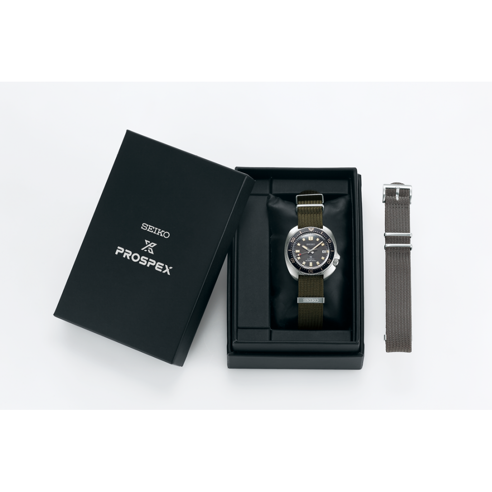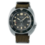 Seiko Prospex 1970 Mechanical Divers Contemporary Design SBDC143 - men's watch manufactured by Seiko. It is equipped with Japanese automatic movement and 6R35 calibre. Stainless steel, hard coating case of round shape. Case dimensions are 42.7 mm. in diameter and 13.2 mm. in thickness. The dial of this Seiko watch is gray. Display type: analog. This timepiece has sapphire, antireflection coating glass. Fabric band, band color: brown, gray. 200 m. water resistance. The watch is from Seiko Prospex collection. The following features are equipped: antimagnetic, date, glowing hands, glowing markers, screw-down crown.