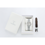 Seiko Prospex Alpinist Mechanical GMT 110th Anniversary Limited Edition SBEJ017 - men's watch made by Seiko. It has Japanese automatic movement and 6R54 calibre. Stainless steel, diamond shield case of round shape. Case dimensions are 39.5 mm. in diameter and 13.6 mm. in thickness. The dial of this Seiko watch is white. Display type: analog. This timepiece has sapphire, antireflection coating glass. Stainless steel, calf leather band, band color: silver, brown. 200 m. water resistance. The watch is from Seiko Prospex collection. The following features are equipped: antimagnetic, screw-down crown, glowing hands, glowing markers, date, dual time, limited edition.