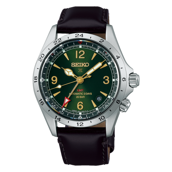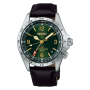 Seiko Prospex Alpinist SBEJ005 - men's watch manufactured by Seiko. It has Japanese automatic movement and 6R54 calibre. Stainless steel, diamond shield case of round shape. Case dimensions are 39.5 mm. in diameter and 13.6 mm. in thickness. The dial of this Seiko watch is green. Display type: analog. This timepiece has sapphire, antireflection coating glass. Calf leather band, band color: brown. 200 m. water resistance. The watch is from Seiko Prospex collection. The following features are equipped: antimagnetic, screw-down crown, glowing hands, glowing markers, date, dual time.