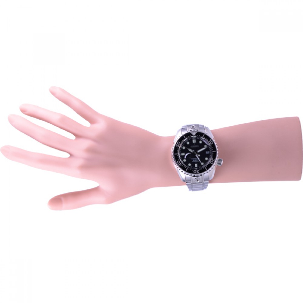 Seiko Prospex SBDB011 - men's watch produced by Seiko. It is equipped with Japanese automatic movement and 5R66 calibre. Titanium, hard coating case of round shape. Case dimensions are 46 mm. in diameter and 17 mm. in thickness. The dial of this Seiko watch is black. Display type: analog. This timepiece has sapphire glass. Titanium, hard coating band, band color: silver. 600 m. water resistance. The watch is from Seiko Prospex collection. The following features are equipped: date, dual time, power reserve indicator, glowing hands, glowing markers, antimagnetic, screw-down crown.