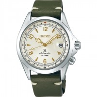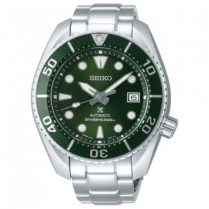 Seiko Prospex SBDC081 - men's watch produced by Seiko. It is equipped with Japanese automatic movement and 6R35 calibre. Stainless steel case of round shape. Case dimensions are 45 mm. in diameter and 12.9 mm. in thickness. The dial of this Seiko watch is green. Display type: analog. This timepiece has sapphire glass. Stainless steel band, band color: silver. 200 m. water resistance. The watch is from Seiko Prospex collection. The following features are equipped: date, antimagnetic, glowing hands, glowing markers, screw-down crown.