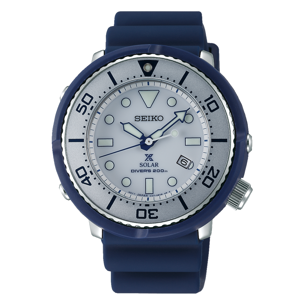 Seiko Prospex SBDN055 - men's watch produced by Seiko. It is equipped with Japanese solar quartz movement and V147 calibre. Stainless steel, polymer case of round shape. Case dimensions are 45.9 mm. in diameter and 12.1 mm. in thickness. The dial of this Seiko watch is white. Display type: analog. This timepiece has hardlex glass. Polymer band, band color: blue. 200 m. water resistance. The watch is from Seiko Prospex collection. The following features are equipped: antimagnetic, date, glowing hands, glowing markers, screw-down crown, limited edition.