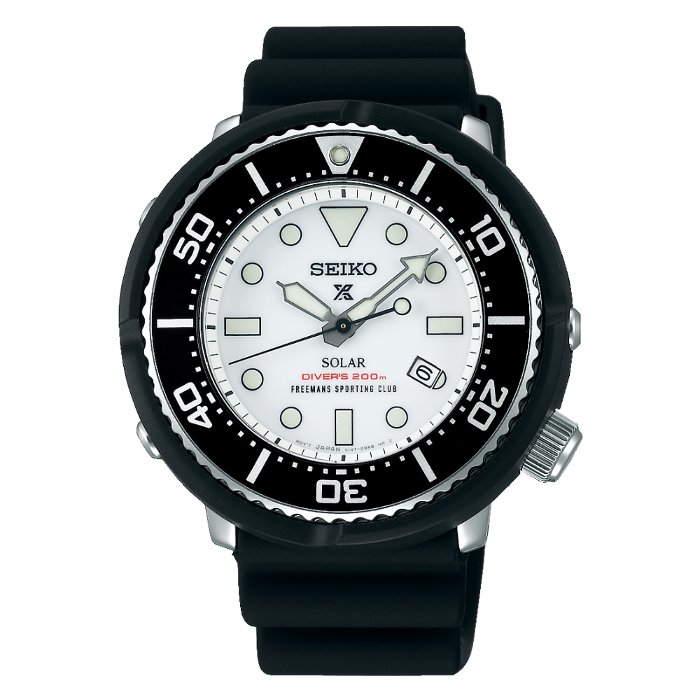 Seiko Prospex SBDN059 - men's watch produced by Seiko. It has Japanese solar quartz movement and V147 calibre. Stainless steel, polymer case of round shape. Case dimensions are 45.9 mm. in diameter and 12.1 mm. in thickness. The dial of this Seiko watch is white. Display type: analog. This timepiece has hardlex glass. Polymer band, band color: black. 200 m. water resistance. The watch is from Seiko Prospex collection. The following features are equipped: antimagnetic, date, glowing hands, glowing markers, screw-down crown.