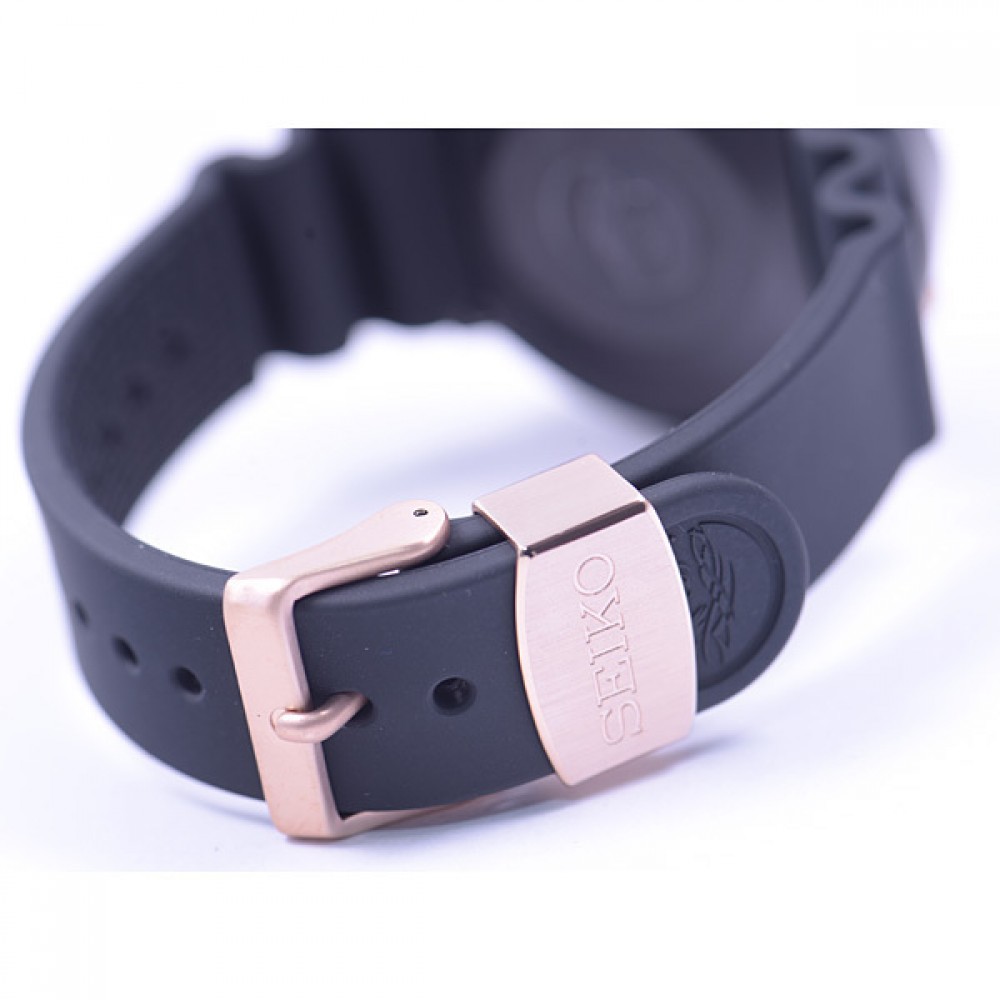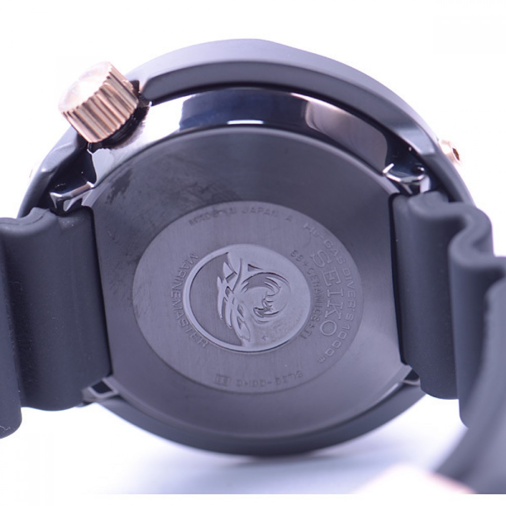Seiko Prospex SBDX014 - men's watch made by Seiko. It has Japanese automatic movement and 8L35 calibre. Titanium, ceramic, hard coating, stainless steel, gold plated case of round shape. Case dimensions are 52.4 mm. in diameter and 17.2 mm. in thickness. The dial of this Seiko watch is black. Display type: analog. This timepiece has sapphire glass. Polymer band, band color: black. 1000 m. water resistance. The watch is from Seiko Prospex collection. The following features are equipped: antimagnetic, date, glowing hands, glowing markers, screw-down crown.