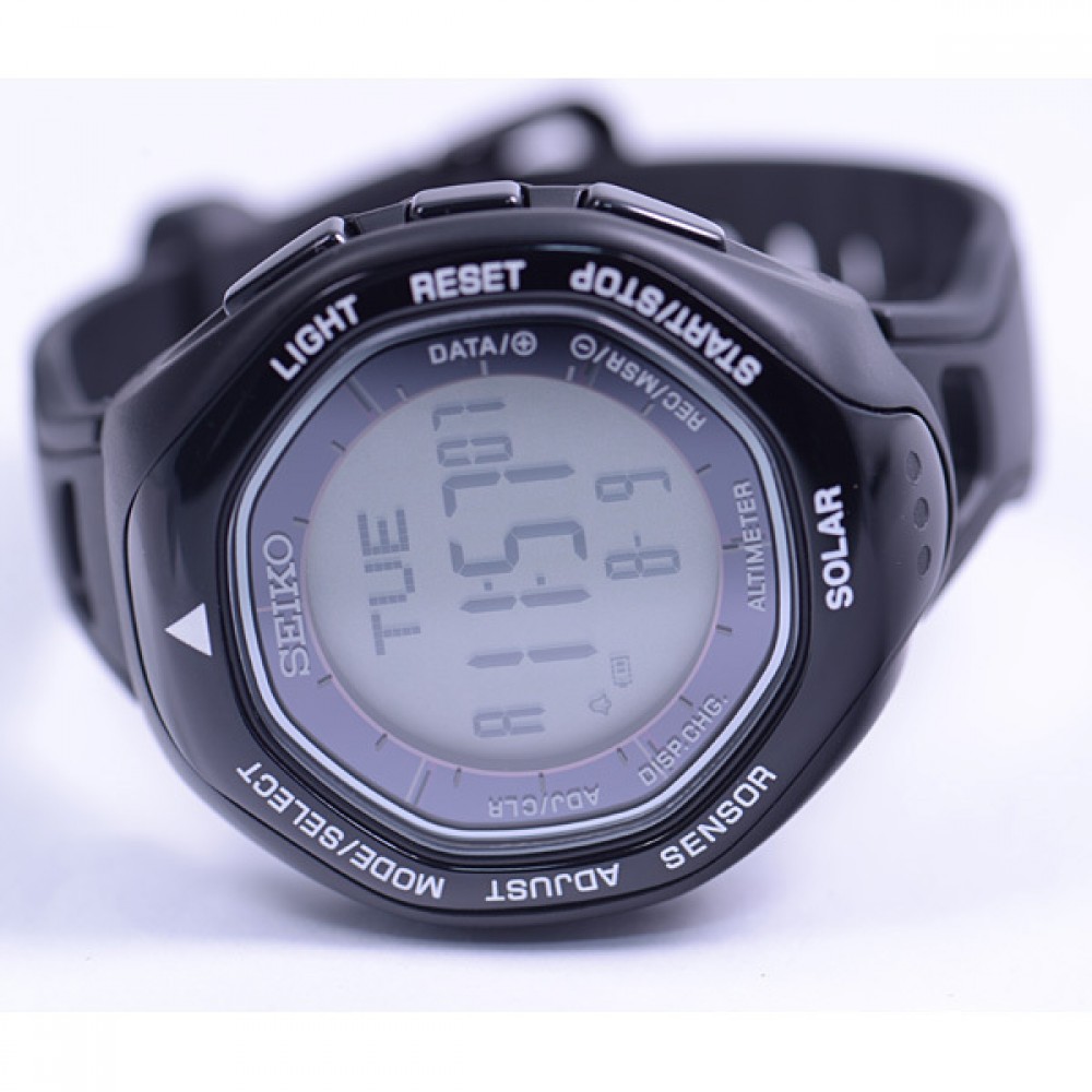 Seiko Prospex SBEB001 - men's watch produced by Seiko. It is equipped with Japanese solar quartz movement and S822 calibre. Aluminum, polymer case of polygon shape. Case dimensions are 44.8 mm. in diameter and 12.7 mm. in thickness. The dial of this Seiko watch is lcd. Display type: digital. This timepiece has hardlex glass. Polymer band, band color: black. 100 m. water resistance. The watch is from Seiko Prospex collection. The following features are equipped: date, day, month, backlight, altimeter, barometer, thermometer, compass, chronograph, alarm, perpetual calendar, world time.