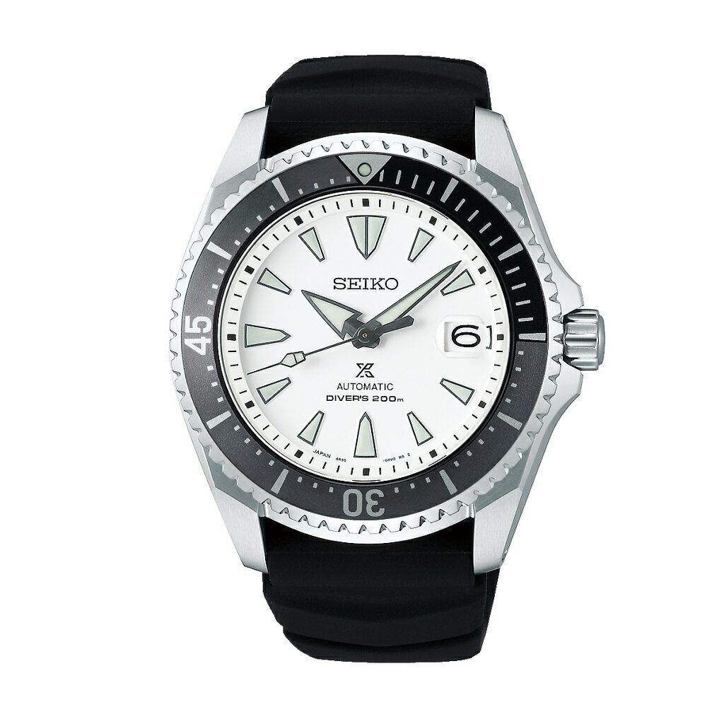 Seiko Prospex Shogun SBDC131 - men's watch manufactured by Seiko. It has Japanese automatic movement and 6R35 calibre. Titanium, hard coating case of round shape. Case dimensions are 43.5 mm. in diameter and 13.3 mm. in thickness. The dial of this Seiko watch is white. Display type: analog. This timepiece has sapphire, antireflection coating glass. Polymer band, band color: black. 200 m. water resistance. The watch is from Seiko Prospex collection. The following features are equipped: date, antimagnetic, glowing hands, glowing markers, screw-down crown.