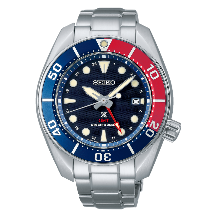 Seiko Prospex Solar GMT SBPK005 - men's watch manufactured by Seiko. It is equipped with Japanese solar quartz movement and 5K65 calibre. Stainless steel case of round shape. Case dimensions are 45 mm. in diameter and 13.2 mm. in thickness. The dial of this Seiko watch is navy. Display type: analog. This timepiece has sapphire, antireflection coating glass. Stainless steel band, band color: silver. 200 m. water resistance. The watch is from Seiko Prospex collection. The following features are equipped: date, antimagnetic, screw-down crown, glowing hands, glowing markers, dual time.