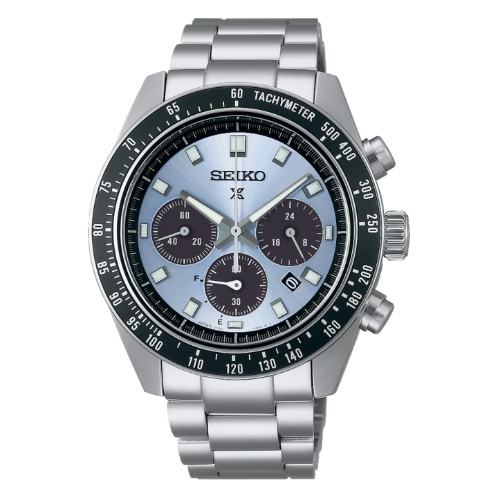 Seiko Prospex Speedtimer SBDL109 - men's watch made by Seiko. It has Japanese solar quartz movement and V192 calibre. Stainless steel case of round shape. Case dimensions are 41.4 mm. in diameter and 13 mm. in thickness. The dial of this Seiko watch is blue. Display type: analog. This timepiece has sapphire, antireflection coating glass. Stainless steel band, band color: silver. 100 m. water resistance. The watch is from Seiko Prospex collection. The following features are equipped: antimagnetic, chronograph, power reserve indicator, date, glowing hands, glowing markers.