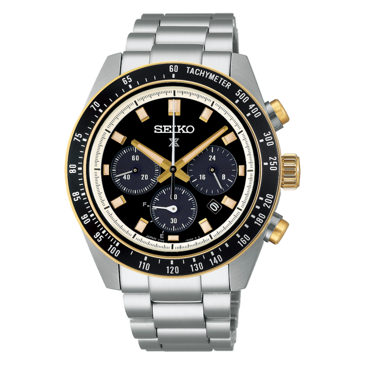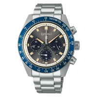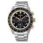 Seiko Prospex Speedtimer SBDL113 - men's watch made by Seiko. It has Japanese solar quartz movement and V192 calibre. Stainless steel, gold plated case of round shape. Case dimensions are 41.4 mm. in diameter and 13 mm. in thickness. The dial of this Seiko watch is anthracite. Display type: analog. This timepiece has sapphire, antireflection coating glass. Stainless steel band, band color: silver. 100 m. water resistance. The watch is from Seiko Prospex collection. The following features are equipped: chronograph, power reserve indicator, date, antimagnetic, glowing hands, glowing markers.