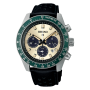 Seiko Prospex Speedtimer SBDL115 - men's watch produced by Seiko. It has Japanese solar quartz movement and V192 calibre. Stainless steel case of round shape. Case dimensions are 41.4 mm. in diameter and 13 mm. in thickness. The dial of this Seiko watch is light gold. Display type: analog. This timepiece has sapphire, antireflection coating glass. Calf leather band, band color: black. 100 m. water resistance. The watch is from Seiko Prospex collection. The following features are equipped: chronograph, power reserve indicator, date, antimagnetic, glowing hands, glowing markers.