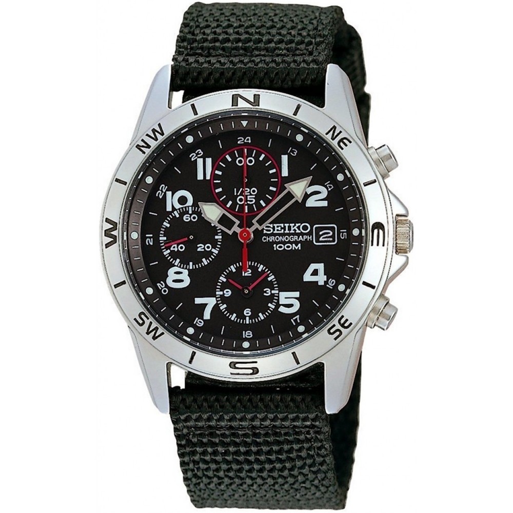 Seiko Quartz Chronograph SZER016 - men's watch made by Seiko. It is equipped with Japanese quartz movement and 7T92 calibre. Stainless steel case of round shape. Case dimensions are 39 mm. in diameter and 10 mm. in thickness. The dial of this Seiko watch is black. Display type: analog. This timepiece has hardlex glass. Fabric band, band color: black. 100 m. water resistance. The watch is from Seiko Quartz collection. The following features are equipped: date, glowing hands, glowing markers, chronograph.