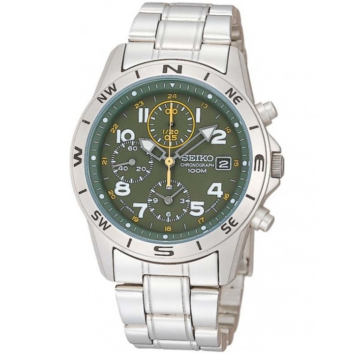 Seiko Quartz Chronograph SZER017 - men's watch made by Seiko. It has Japanese quartz movement and 7T92 calibre. Stainless steel case of round shape. Case dimensions are 38 mm. in diameter and 10 mm. in thickness. The dial of this Seiko watch is green. Display type: analog. This timepiece has hardlex glass. Stainless steel band, band color: silver. 100 m. water resistance. The watch is from Seiko Quartz collection. The following features are equipped: date, glowing hands, glowing markers, chronograph.
