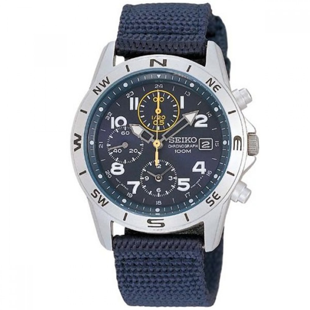 Seiko Quartz Chronograph SZER020 - men's watch manufactured by Seiko. It is equipped with Japanese quartz movement and 7T92 calibre. Stainless steel case of round shape. Case dimensions are 38 mm. in diameter and 10 mm. in thickness. The dial of this Seiko watch is blue. Display type: analog. This timepiece has hardlex glass. Fabric band, band color: blue. 100 m. water resistance. The watch is from Seiko Quartz collection. The following features are equipped: date, glowing hands, glowing markers, chronograph.