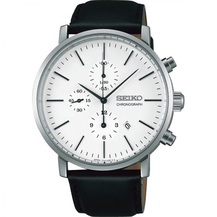 Seiko Quartz Chronograph SZER041 - men's watch made by Seiko. It has Japanese quartz movement and 7T92 calibre. Stainless steel case of round shape. Case dimensions are 42 mm. in diameter and 10.4 mm. in thickness. The dial of this Seiko watch is white. Display type: analog. This timepiece has hardlex glass. Leather band, band color: black. 100 m. water resistance. The watch is from Seiko Quartz collection. The following features are equipped: date, chronograph.