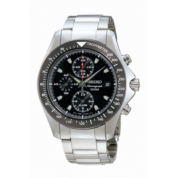 Seiko Quartz Chronograph SZET004 - men's watch manufactured by Seiko. It is equipped with Japanese quartz movement and 7T62 calibre. Stainless steel case of round shape. Case dimensions are 40 mm. in diameter and 12 mm. in thickness. The dial of this Seiko watch is black. Display type: analog. This timepiece has hardlex glass. Stainless steel band, band color: silver. 100 m. water resistance. The watch is from Seiko Quartz collection. The following features are equipped: date, chronograph, alarm, glowing hands, glowing markers.