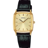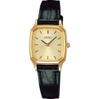 Seiko Quartz SZPW076 - ladies watch manufactured by Seiko. It has Japanese quartz movement. Stainless steel, gold plated case of round shape. Case dimensions are 24 mm. in diameter and 7 mm. in thickness. The dial of this Seiko watch is gold. Display type: analog. This timepiece has hardlex glass. Leather band, band color: black. 50 m. water resistance. The watch is from Seiko Quartz collection.