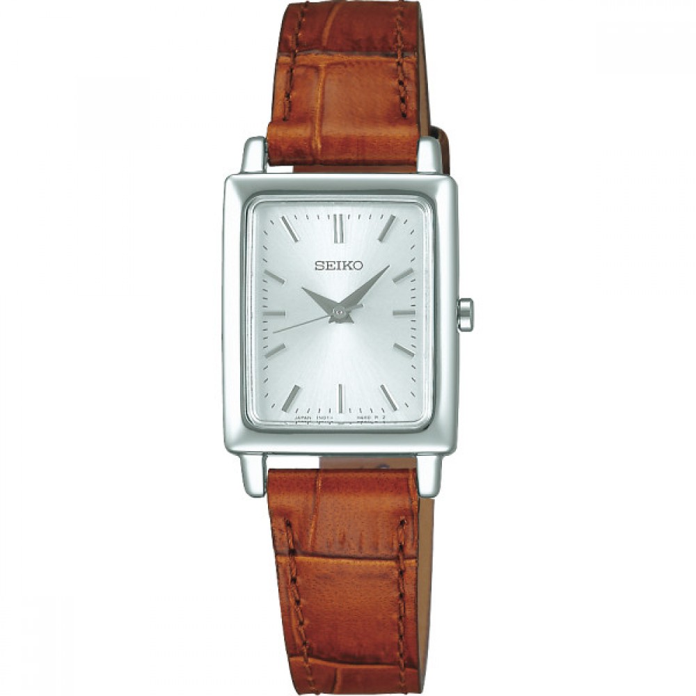 Seiko Quartz SZPW079 - ladies watch made by Seiko. It has Japanese quartz movement. Stainless steel case of rectangle shape. Case dimensions are 21 mm. in diameter and 6 mm. in thickness. The dial of this Seiko watch is silver. Display type: analog. This timepiece has hardlex glass. Leather band, band color: brown. 50 m. water resistance. The watch is from Seiko Quartz collection.