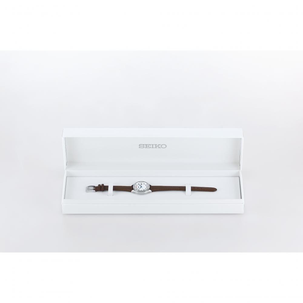 Seiko Selection 110th Anniversary Limited Edition STPX099 - ladies watch made by Seiko. It has Japanese solar quartz movement and V137 calibre. Stainless steel case of round shape. Case dimensions are 27.8 mm. in diameter and 7.3 mm. in thickness. The dial of this Seiko watch is white. Display type: analog. This timepiece has sapphire glass. Leather band, band color: brown. 100 m. water resistance. The watch is from Seiko Selection collection. The following features are equipped: date, limited edition.