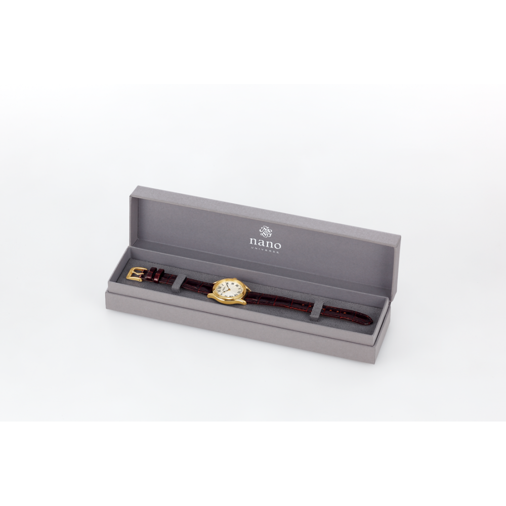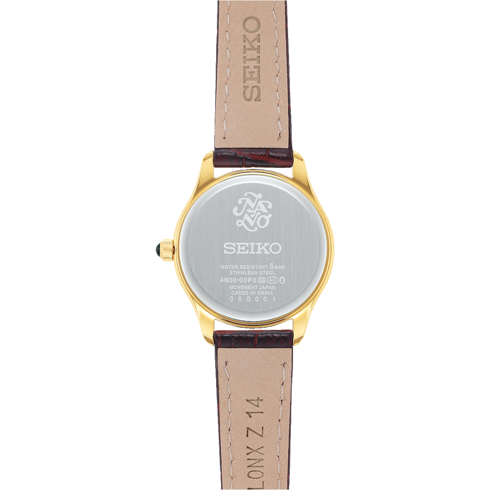 Seiko Selection Ladies Battery Operated Quartz nano・universe Special Edition SSEH014 - ladies watch made by Seiko. It has Japanese quartz movement and 4N30 calibre. Stainless steel, gold plated case of round shape. Case dimensions are 29 mm. in diameter and 7.1 mm. in thickness. The dial of this Seiko watch is silver. Display type: analog. This timepiece has hardlex glass. Calf leather band, band color: dark wine red. 50 m. water resistance. The watch is from Seiko Selection collection. The following features are equipped: antimagnetic.
