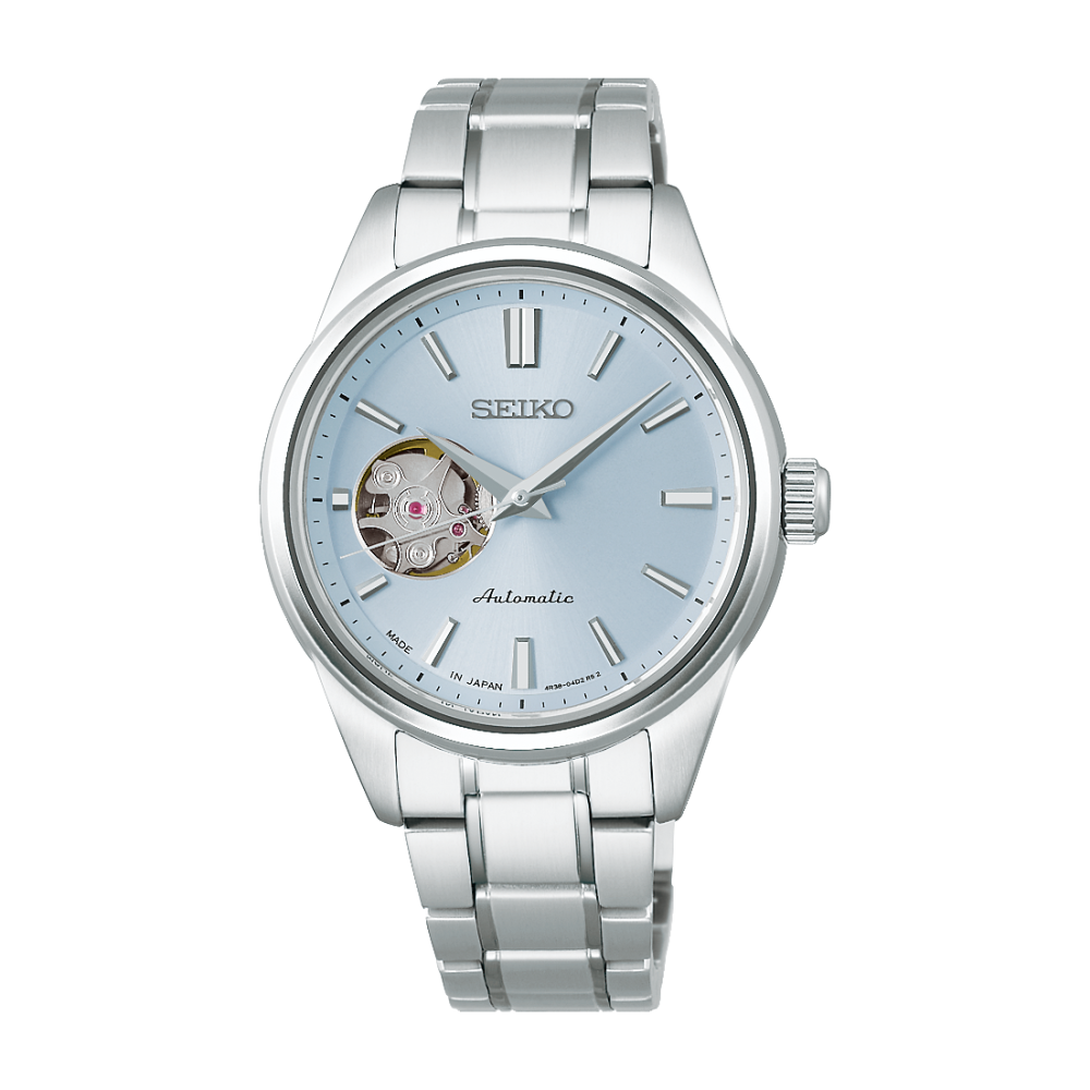 Seiko Selection Ladies Mechanical Spring 2026 Limited Edition SSDE025 - ladies watch manufactured by Seiko. It is equipped with Japanese automatic movement and 4R38 calibre. Stainless steel case of round shape. Case dimensions are 34.2 mm. in diameter and 10.8 mm. in thickness. The dial of this Seiko watch is light blue. Display type: analog. This timepiece has hardlex glass. Stainless steel band, band color: silver. 100 m. water resistance. The watch is from Seiko Selection collection. The following features are equipped: antimagnetic, limited edition.