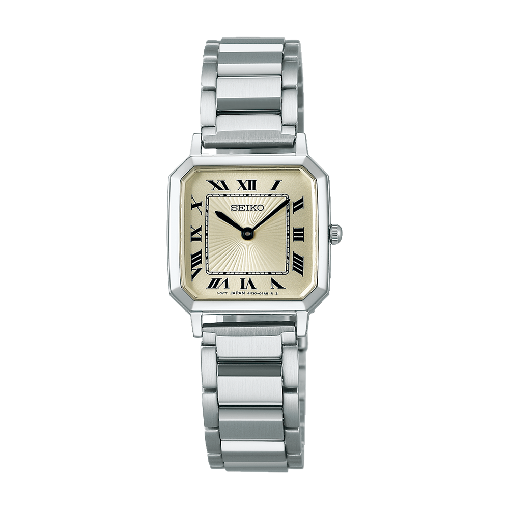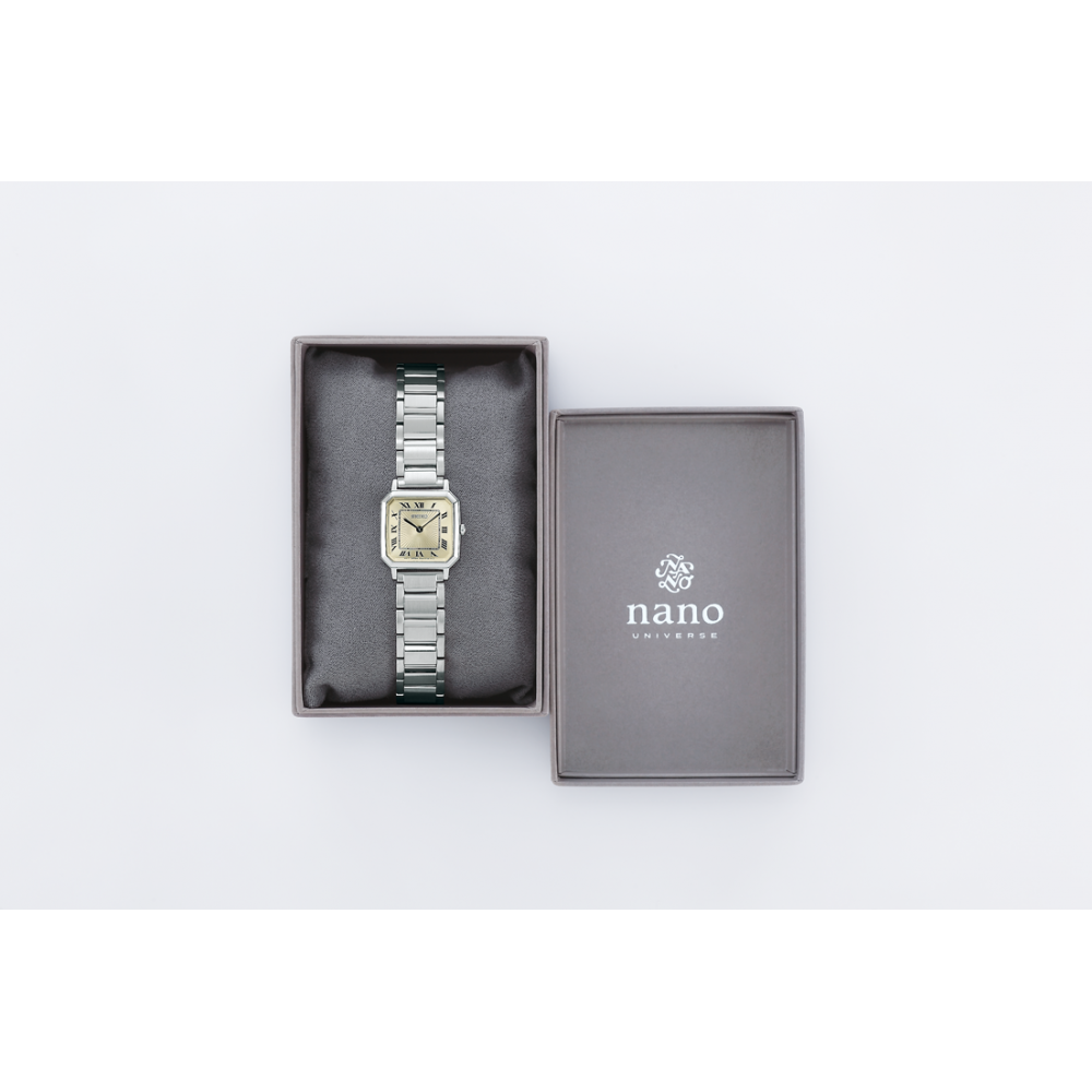 Seiko Selection nano・universe Special Edition SSEH015 - ladies watch made by Seiko. It has Japanese quartz movement and 4N30 calibre. Stainless steel case of square shape. Case dimensions are 22..7 mm. in diameter and 6.4 mm. in thickness. The dial of this Seiko watch is beige. Display type: analog. This timepiece has hardlex glass. Stainless steel band, band color: silver. 50 m. water resistance. The watch is from Seiko Selection collection. The following features are equipped: antimagnetic.