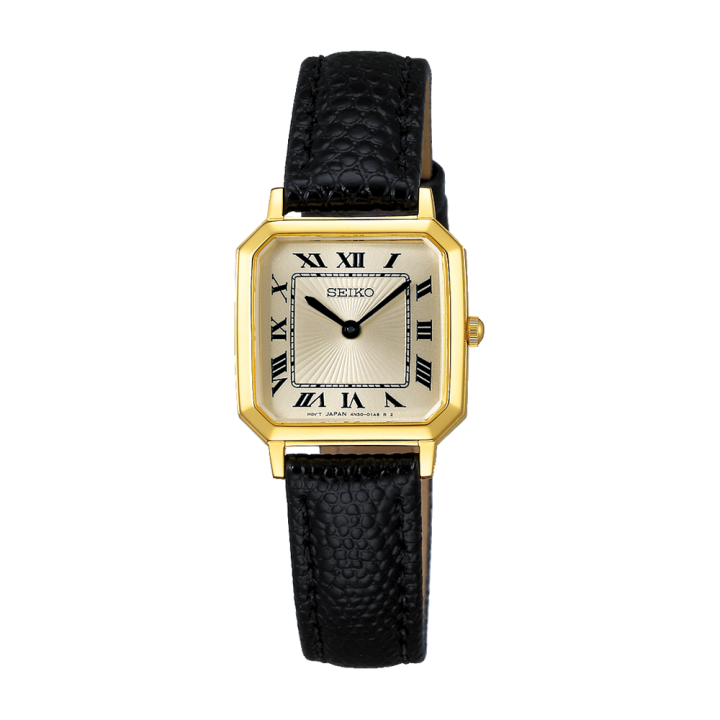Seiko Selection nano・universe Special Edition SSEH018 - ladies watch manufactured by Seiko. It has Japanese quartz movement and 4N30 calibre. Stainless steel, gold plated case of square shape. Case dimensions are 22..7 mm. in diameter and 6.4 mm. in thickness. The dial of this Seiko watch is gold. Display type: analog. This timepiece has hardlex glass. Calf leather band, band color: black. 50 m. water resistance. The watch is from Seiko Selection collection. The following features are equipped: antimagnetic.
