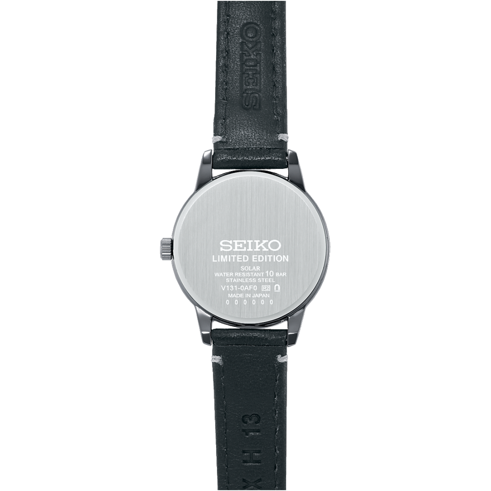 Seiko Selection Pair Collection Limited Edition STPX091 - ladies watch produced by Seiko. It has Japanese solar quartz movement and V131 calibre. Stainless steel, hard coating case of round shape. Case dimensions are 27.8 mm. in diameter and 7.2 mm. in thickness. The dial of this Seiko watch is black. Display type: analog. This timepiece has sapphire glass. Leather band, band color: black. 100 m. water resistance. The watch is from Seiko Selection collection. The following features are equipped: antimagnetic, limited edition.