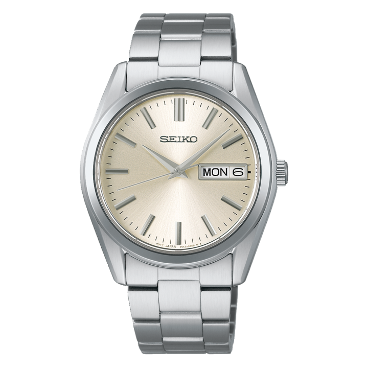 Seiko Selection S Series SBTH007 - men's watch made by Seiko. It has Japanese quartz movement and 6N53 calibre. Stainless steel case of round shape. Case dimensions are 37.4 mm. in diameter and 8.4 mm. in thickness. The dial of this Seiko watch is beige. Display type: analog. This timepiece has sapphire, antireflection coating glass. Stainless steel band, band color: silver. 100 m. water resistance. The watch is from Seiko Selection collection. The following features are equipped: date, day, antimagnetic.